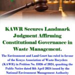 The Kenya Association of Waste Recyclers (KAWR) is pleased to announce that its petition before the Environment and Land Court of Kenya (ELC Petition No. E026 of 2024 dated 3rd July 2024) has been successful. Judgment was delivered on 12th February 2026 in favour of the Petitioner against: